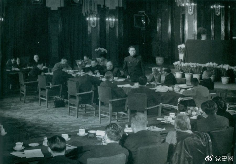 1949年10月21日,周恩來主持召開中央人民政府政務(wù)院第一次會(huì)議。正面左起:陳云、董必武、周恩來、郭沫若、黃炎培。