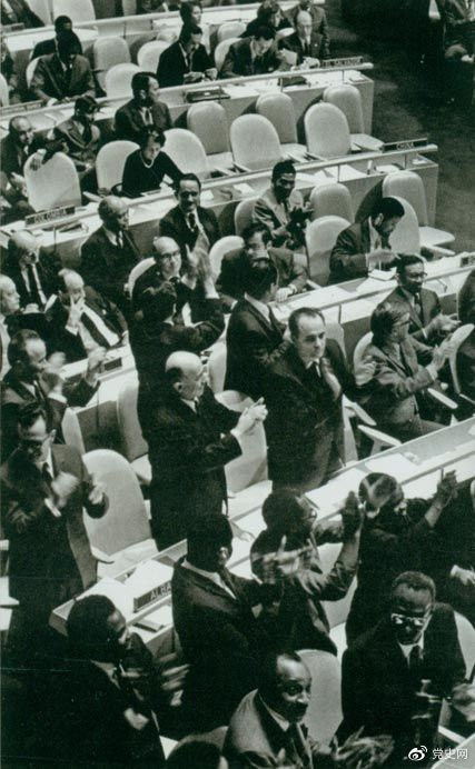 10月25日 第二十六屆聯(lián)合國大會以壓倒性多數(shù)的票數(shù)通過2758號決議,恢復(fù)中華人民共和國在聯(lián)合國的一切合法權(quán)利,并立即把蔣介石集團(tuán)的“代表”從聯(lián)合國及其所屬一切機(jī)構(gòu)中驅(qū)逐出去。11月15日,中華人民共和國代表團(tuán)首次出席聯(lián)合國大會。