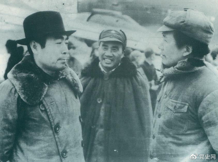 1945年11月11日,毛澤東、朱德赴延安機場迎接從重慶回來的周恩來。